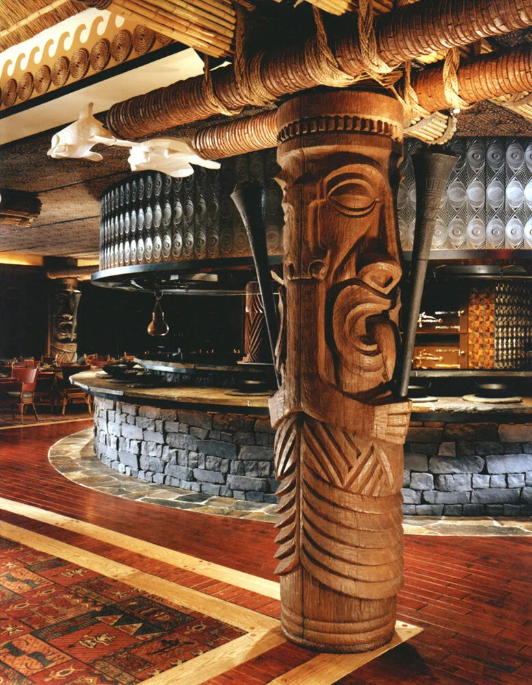 99 panels above firepit / 12 free standing tiki sculpture / all wall art / all sisal lashing