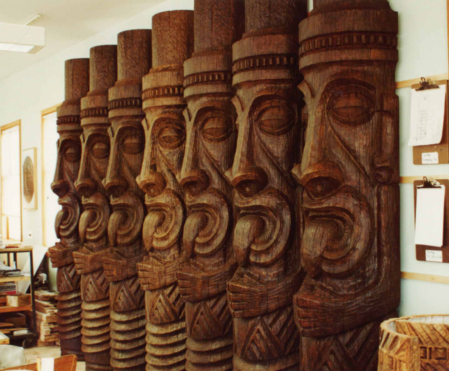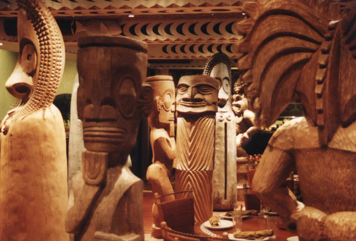 99 panels above firepit / 12 free standing tiki sculpture / all wall art / all sisal lashing